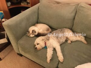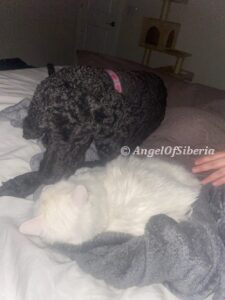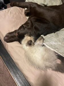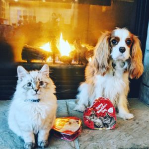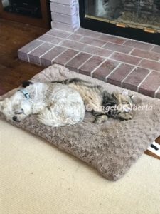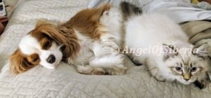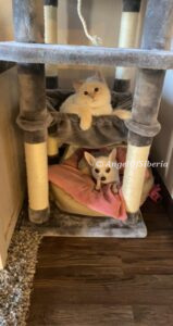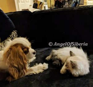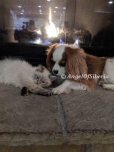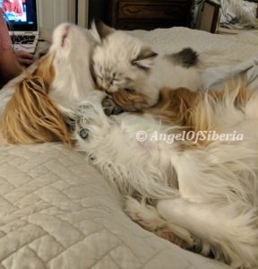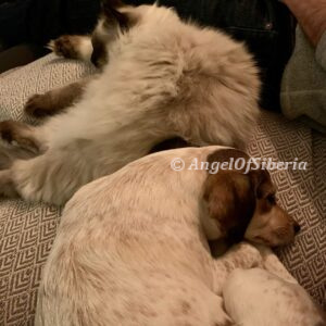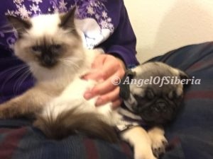 Do our cats get along with dogs? Yes, they do! They make great friends and we have a lot of testimonials and pictures of our cats being friendly with their doggy buddies.